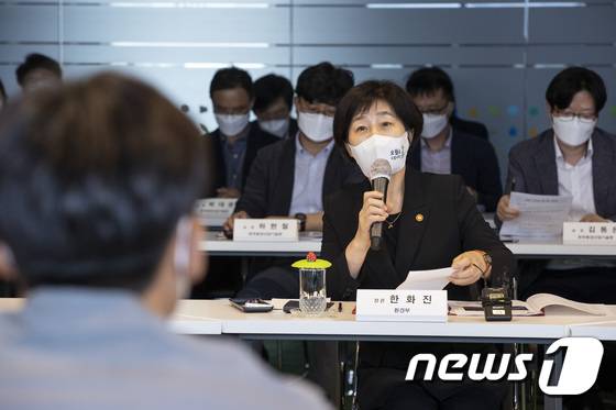 (서울=뉴스1) = 한화진 환경부 장관이 18일 오후 인천 서구에 위치한 환경산업연구단지를 방문해 입주기업협의회 대표, ICT 벤처 스타트분야 입주기업 등과 간담회를 갖고 있다. (환경부 제공) 2022.5.18/뉴스1