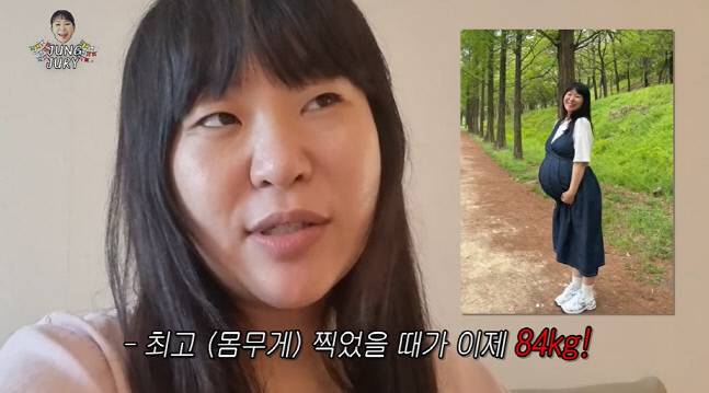 정주리는 “지금 몸무게가 79kg이다. 최고가 84kg이었다. 아기 몸무게가 3.74kg인데 태반, 양수 1.26kg 딱 그것만 빠졌다. 몸무게가 안 준다”고 좌절했다.