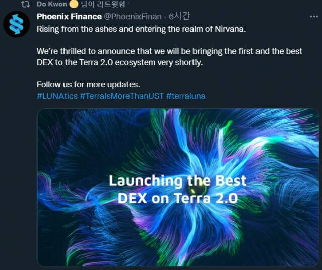 18일 권도형 대표는 트위터에 '피닉스 파이낸스'라는 계정의 소개글을 공유했다. 해당 계정은 "테라 2.0 생태계를 위한 최초이자 최고의 탈중앙화거래소(DEX)를 제공하게 돼 기쁘다"고 언급하고 있다. 계정 프로필도 "테라 2.0의 플래그십 DEX"라고 적혀 있다. 해당 계정 운영 주체가 누구인지는 밝혀지지 않은 상태다.