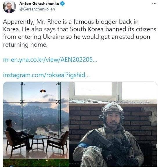 안톤 게라셴코 우크라이나 내무부 장관 보좌관은 16일(이하 현지시간) 트위터(사진)에 "듣자 하니 이(이근 전 대위)씨는 한국에서 유명한 블로거인 것 같다"며 "그는 한국이 자국민의 우크라이나 입국을 금지하고 있어 본국으로 귀국하면 체포될 것이라고 말하고 있다"고 올렸다.