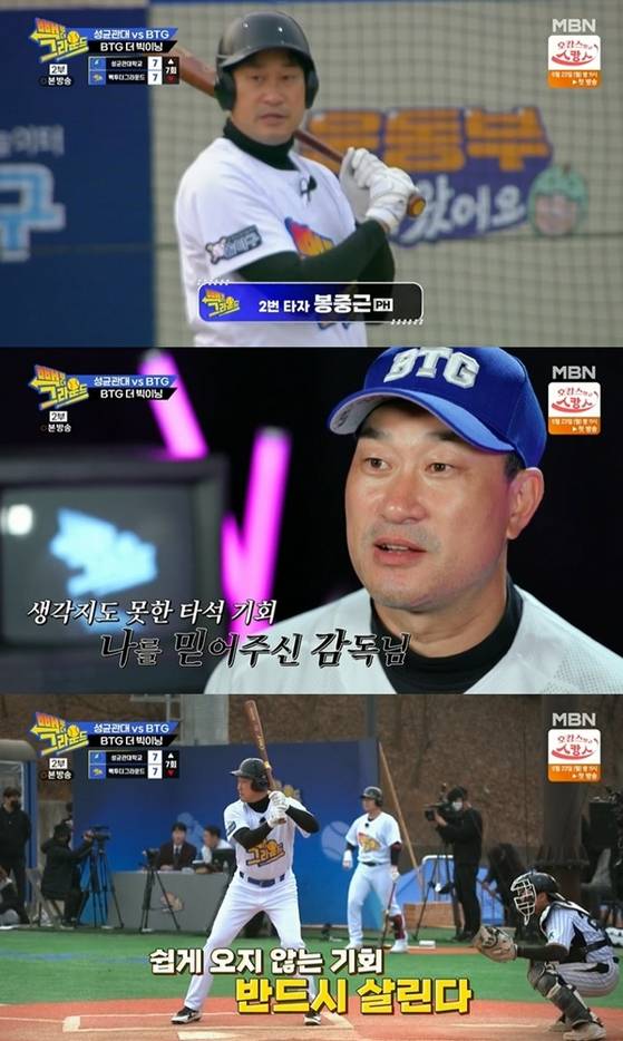 이날 ‘빽 투 더 그라운드’ 선수들과 성균관대학교 선수들의 대결이 펼쳐진 가운데, 봉중근은 동점 상황에서 대타 타자로 타석에 들어섰다.