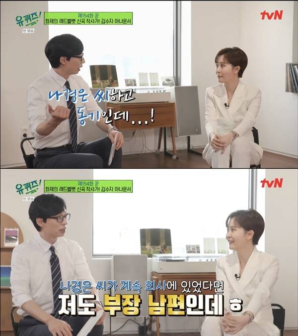 그 말을 들은 유재석은 "김정근 아나운서가 벌써 부장님이냐. 나경은 씨하고 동기인데, 김정근 아나운서가 벌써 부장님이 됐구나"라며 "나경은 씨가 계속 회사에 있었다면 저도 부장 남편인데"라고 너스레를 떨었다.