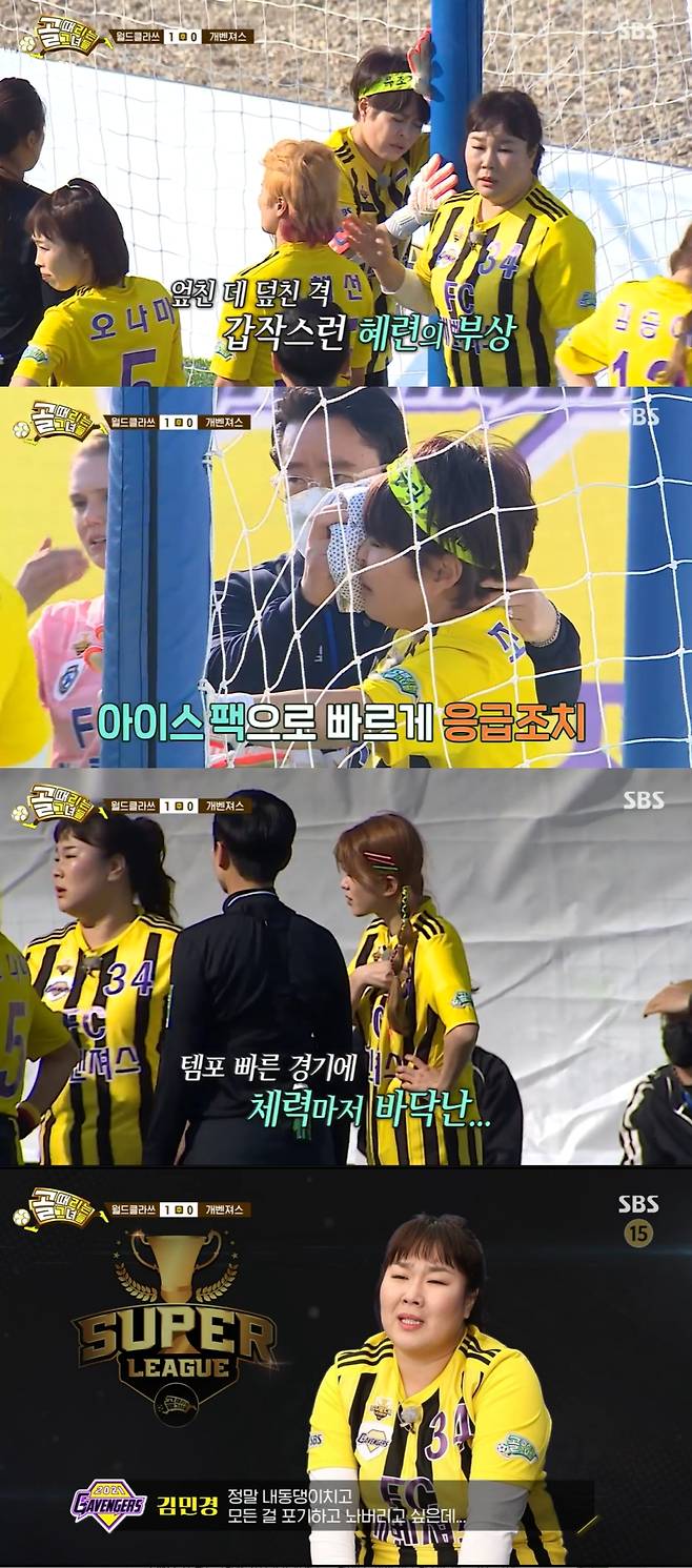 개벤져스 조혜련 골키퍼, 김민경 선수가 온몸을 던지다 부상을 당했다.