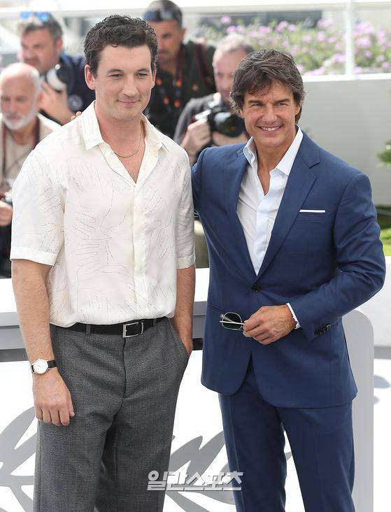 배우 마일즈 텔러, 톰 크루즈가 18일(현지시간) 오후 프랑스 칸 팔레 데 페스티발에서 열린 '제 75회 칸 국제영화제'(Cannes Film Festival) ‘탑건: 매버릭’ 포토콜에 참석해 포즈를 취하고 있다.