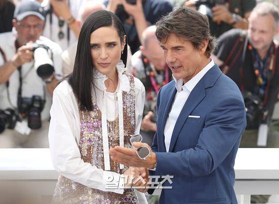 배우 제니퍼 코넬리, 톰 크루즈가 18일(현지시간) 오후 프랑스 칸 팔레 데 페스티발에서 열린 '제 75회 칸 국제영화제'(Cannes Film Festival) ‘탑건: 매버릭’ 포토콜에 참석해 포즈를 취하고 있다.