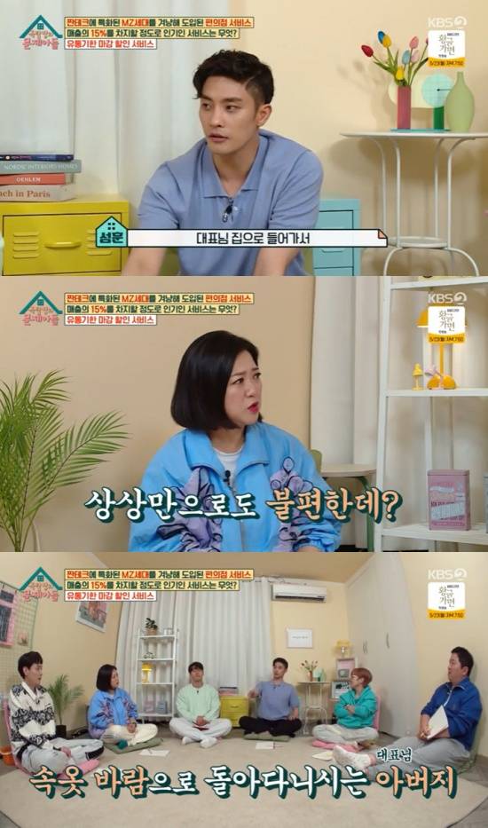 "그래서 따로 산다고 할 줄 알았다"라고 말하는 송은이와 "듣기만 해도 너무 불편하다. 안 불편했냐"라는 김숙의 말에 성훈은 아무렇지 않게 대답을 이어나갔다. 성훈은 당시 대표의 부모님 집을 회상하며 "대표님 집 분위기가 집 안에 있어도 다 옷을 입고 돌아다는 것이다"라고 말했다.
