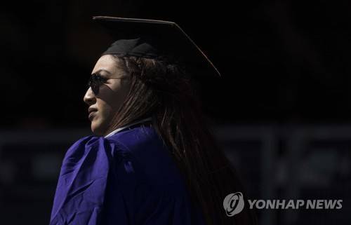 epa09955331 A member of New York University's class of 2022 waits for the start of the school's commencement ceremony being held at Yankees Stadium in the Bronx borough of New York, New York, USA, 18 May 2022. EPA/JUSTIN LANE