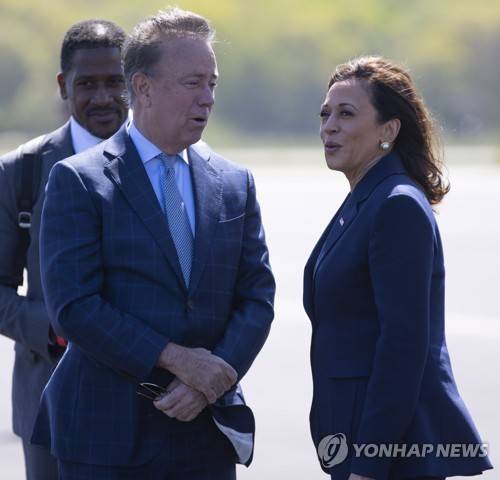 epa09955327 United States Vice President Kamala Harris meets with Connecticut Governor Ned Lamont (L) at New London Groton Airport before addressing the 2022 graduating class at the United States Coast Guard Academy Commencement Ceremony at Cadet Memorial Field in New London, Connecticut, USA, 18 May 2022. EPA/CJ GUNTHER