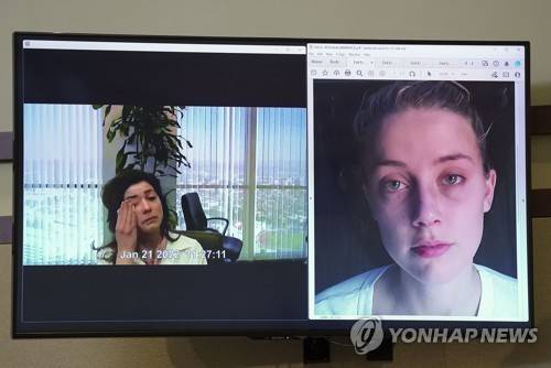 Raquel Pennington testifies in a previously recorded video deposition, as a picture of actor Amber Heard is seen on screen in the courtroom at the Fairfax County Circuit Courthouse in Fairfax, Va., Wednesday, May 18, 2022. Actor Johnny Depp sued his ex-wife Amber Heard for libel in Fairfax County Circuit Court after she wrote an op-ed piece in The Washington Post in 2018 referring to herself as a "public figure representing domestic abuse." (Kevin Lamarque/Pool Photo via AP) POOL PHOTO