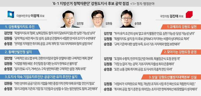 ‘6·1 지방선거 정치·행정분야 정책자문단’은 두 후보가 제시한 공약의 취지에 대해 공감했지만 세밀한 분석과 구체적인 설계방안, 강원 미래 비전에 대한 세부안은 부족했다고 평가했다. 정치·행정분야 공약(각 3개)과 관련, 더불어민주당 이광재 후보는 △강원특별자치도 추진 △동해안발전청 추진 △도지사 직속 기업유치추진단·공공기관 유치 추진단 설치 등을, 국민의힘 김진태 후보는 △규제프리 강원도 실현 △찾아가는 강원도청 운영 △상설 강원도산불방지대책본부 신설 등을 각각 제시했다.
