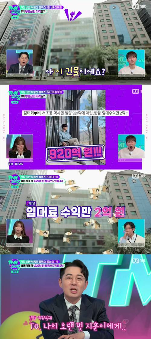 붐은 이어 "강남역 초초초 초 역세권! 도보 3분 거리의 빌딩. 무려 920억 원에 매입했다"라며 "지하 2층, 지상 8층 규모의 이 빌딩은 다양한 업체들이 입점해 있다. 한 달 임대료 수익만 2억 원이다. 이 빌딩은 비, 김태희의 회사가 공동 매입한 건물이라고 한다"고 설명했다.