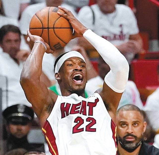 이번 시즌 동부콘퍼런스 정규리그 1위 팀 마이애미는 18일 보스턴(2위)과의 콘퍼런스 결승 1차전 안방경기에서 ‘팔방미인’ 지미 버틀러(사진)의 활약을 앞세워 118-107로 승리했다. 마이애미는 2년 연속 우승을 차지했던 2012∼2013시즌 이후 9년 만에 NBA 파이널 우승을 노리고 있다. 마이애미는 이날 3쿼터에서 보스턴을 14점으로 묶고 39점을 몰아치면서 전세를 갈랐다. 두 팀은 2019∼2020시즌에도 콘퍼런스 결승에서 맞붙었는데 당시 마이애미가 4승 2패로 파이널에 진출했다.
