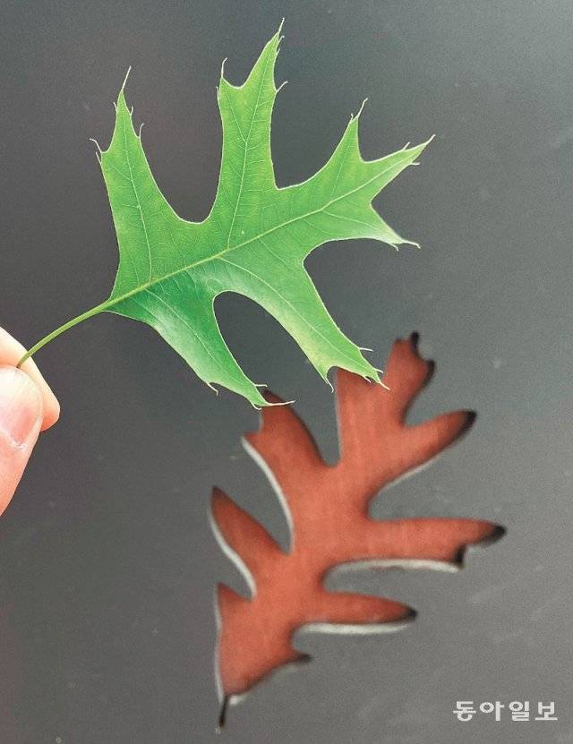 나뭇잎 모양이 새겨진 벤치. 떨어진 대왕참나무 잎을 대보니 비슷하지만 좀 다르네요. 다른 잎이 벤치 주인일까요.