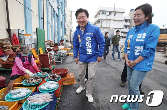 (제주=뉴스1) 오현지 기자 = 6·1 지방선거 공식 선거운동 첫날인 19일 오전 더불어민주당 오영훈 제주도지사 후보가 제주시수협수산물공판장에서 시민들과 인사를 나누고 있다. 2022.5.19/뉴스1