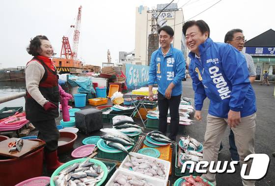 (제주=뉴스1) 오현지 기자 = 6·1 지방선거 공식 선거운동 첫날인 19일 오전 더불어민주당 오영훈 제주도지사 후보가 제주시수협수산물공판장에서 시민들과 인사를 나누고 있다. 2022.5.19/뉴스1