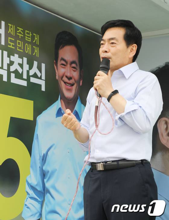 (서귀포=뉴스1) 강승남 기자 = 6·1 지방선거 공식 선거운동 첫날인 19일 오전 무소속 박찬식 제주도지사 후보가 제주 서귀포시 성산읍 고성오일시장에서 유세발언을 하고 있다. 2022.5.19/뉴스1