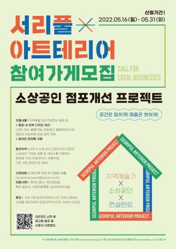 희망자는 오는 31일까지 구청 홈페이지에 공고된 신청서 등 필요 서류를 갖춰 '2022년 서리풀 아트테리어 사업' 담당자 이메일로 제출하고 기타 자세한 사항은 구청 일자리경제과 또는 서리풀 아트테리어 운영 사무국으로 문의하면 된다.