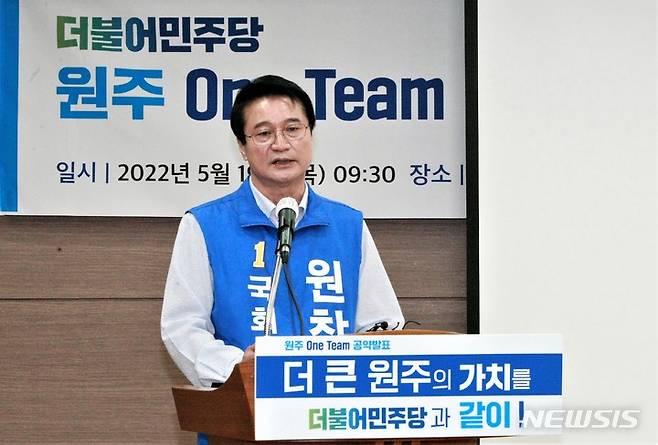 [원주=뉴시스] 이덕화 기자 = 6·1지방선거 공식선거운동이 시작된 19일 원주시청 다목적홀에서 더불어민주당 원주지역 후보들이 '원주 원팀(One Team) 공약' 발표식을 가진 가운데 원창묵 원주갑 국회의원 후보가 "국회에서 더 큰 원주발전을 이뤄 내겠다"며 자신의 공약을 발표하고 있다. 2022.05.19. wonder8768@newsis.com