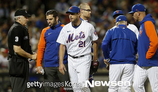 뉴욕 메츠 맥스 슈어저는 5월 19일(한국시간) 미국 뉴욕 시티 필드에서 열린 '2022 메이저리그' 세인트루이스 카디널스와 경기에서 부상으로 교체됐다.