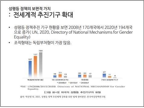 박선영,박복순,김복태,고현승,김은희. "성평등정책 추진체계 강화를 위한 법제 정비 방안". 한국여성정책연구원. 2021.