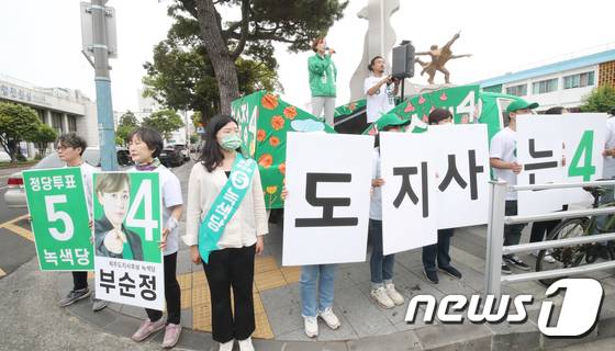 (제주=뉴스1) 오현지 기자 = 6·1 지방선거 공식 선거운동 첫날인 19일 오전 녹색당 부순정 제주도지사 후보가 제주시청 인근에서 유세발언을 하고 있다. 2022.5.19/뉴스1