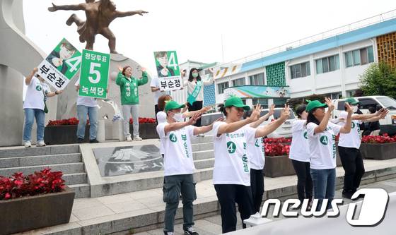 (제주=뉴스1) 오현지 기자 = 6·1 지방선거 공식 선거운동 첫날인 19일 오전 녹색당 부순정 제주도지사 후보와 선거운동원들이 제주시청 인근에서 선거운동을 하고 있다. 2022.5.19/뉴스1