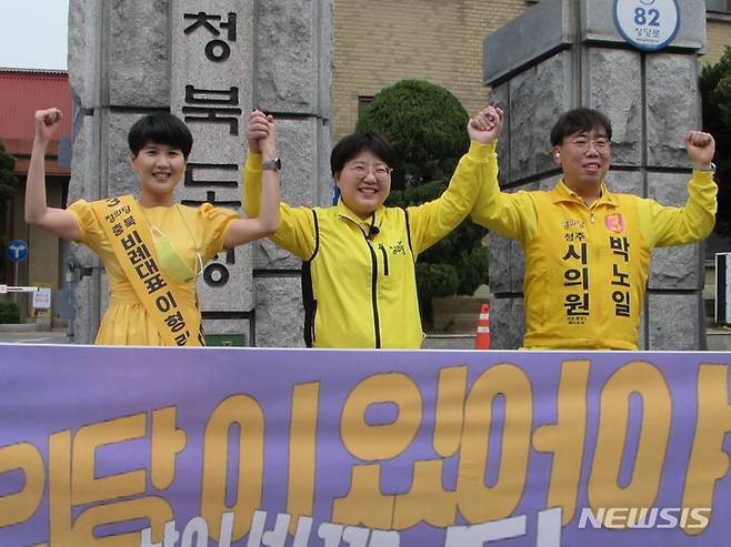 [청주=뉴시스] 천영준 기자 = 정의당 충북도당은 19일 충북도청 서문 앞에서 기자회견을 열고 6·1 지방선거에 출마한 선거구에서 승리하겠다고 밝혔다. 2022.05.19.