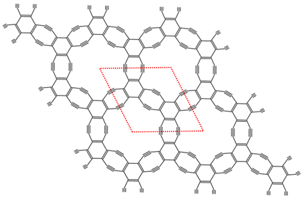 연구팀은 기존 그래핀에 구멍을 내는 방식이 아닌, 원자 단위로부터 탄소 재료를 새롭게 합성하여 규칙적으로 구멍을 생성하는 방식을 적용했다. 연구팀은 이렇게 합성한 물질을 ‘홀리그래파인’라 이름 붙였다. 홀리그래파인은 벤젠 고리(6개의 탄소원자로 이루어져 있는 고리)가 삼중 결합(C≡C)으로 번갈아 연결되어 있으며, 6각형 고리와 8각형 고리의 패턴이 동일한 비율로 구성되어 있는 것이 특징이다.