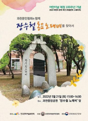 19일 과천시에 따르면 오는 21일 15시 중앙공원 '장수철 노래비' 앞에서 관내 초등학교 어린이들의 동시 낭송, 시민과 함께 동요 부르기, 어린이 즉석 사진 촬영 등이 진행되는 기념행사가 열린다.