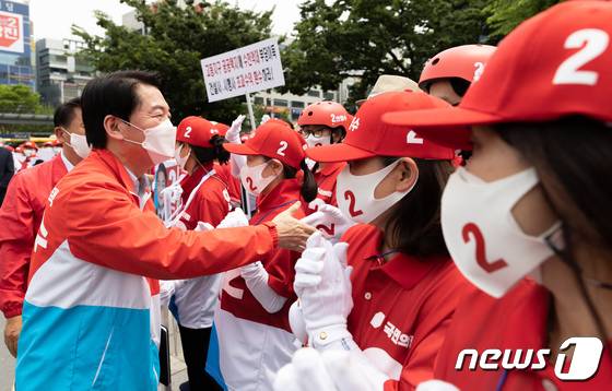 (성남=뉴스1) 이재명 기자 = 안철수 국민의힘 성남 분당갑 후보가 19일 오후 경기도 성남시 분당구 야탑역광장에서 열린 합동 출정식에서 선거운동원들과 인사하고 있다. 2022.5.19/뉴스1