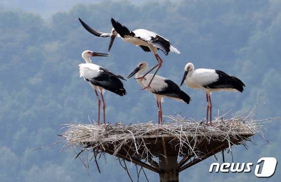 (예산=뉴스1) 김기남 기자 = 충남 예산군 대술면 궐곡리의 황새 인공 둥지탑에서 머물고 있는 어린 천연기념물 황새들이 19일 오후 날개짓 하며 어미를 기다리고 있다. 방사 2세대인 수컷 '행운', 암컷 '현황' 사이에서 지난 3월1일 자연 부화한 새끼 황새들은 6월초 쯤 둥지를 떠나 날아 오를 것으로 보인다. 2022.5.19/뉴스1