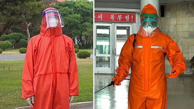 코로나 확산 초기인 2020년엔 북한 방역요원들이 공공장소를 소독할 때 얇은 일회용 마스크만 착용한 경우가 부지기수였고, 간혹 안면마스크가 아닌 방독면이나 고글로 얼굴을 가리기도 했습니다.