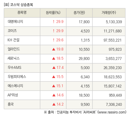 [fnRASSI]장마감, 코스닥 상승 종목(대명에너지 29.9% ↑)