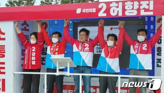 (제주=뉴스1) 홍수영 기자 = 허향진 국민의힘 제주도지사 후보가 19일 오후 서귀포 오일장 앞에서 거리유세를 하고 있다.(허향진선거캠프 제공)2022.5.19/뉴스1