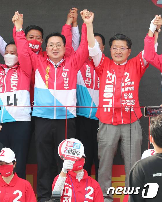 (대전=뉴스1) 김기태 기자 = 이장우 국민의힘 대전시장 후보가 19일 오후 대전시 유성구에서 진동규 유성구청장 후보와 합동유세를 하고 있다. 2022.5.19/뉴스1