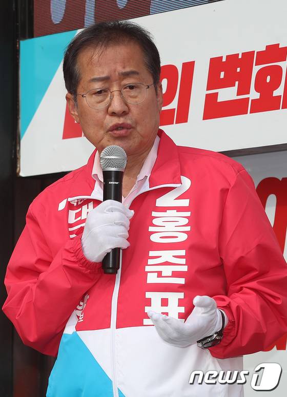 (대구=뉴스1) 공정식 기자 = 홍준표 국민의힘 대구시장 후보가 6·1지방선거 공식선거운동이 시작된 19일 오후 대구 중구 반월당 현대백화점 앞에서 열린 출정식에서 인사말을 하고 있다. 2022.5.19/뉴스1