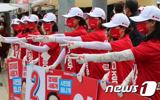 (대전=뉴스1) 김기태 기자 = 19일 오후 대전 유성구에서 국민의힘 선거 운동원들이 지지를 호소하고 있다. 2022.5.19/뉴스1