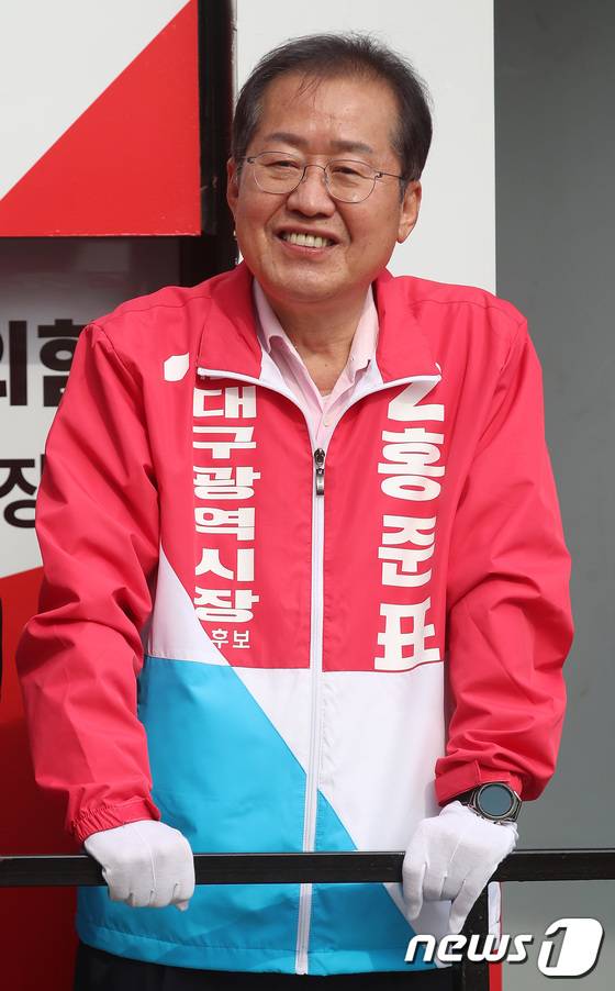 (대구=뉴스1) 공정식 기자 = 홍준표 국민의힘 대구시장 후보가 6·1지방선거 공식선거운동이 시작된 19일 오후 대구 중구 반월당 현대백화점 앞에서 열린 출정식에서 미소를 짓고 있다. 2022.5.19/뉴스1