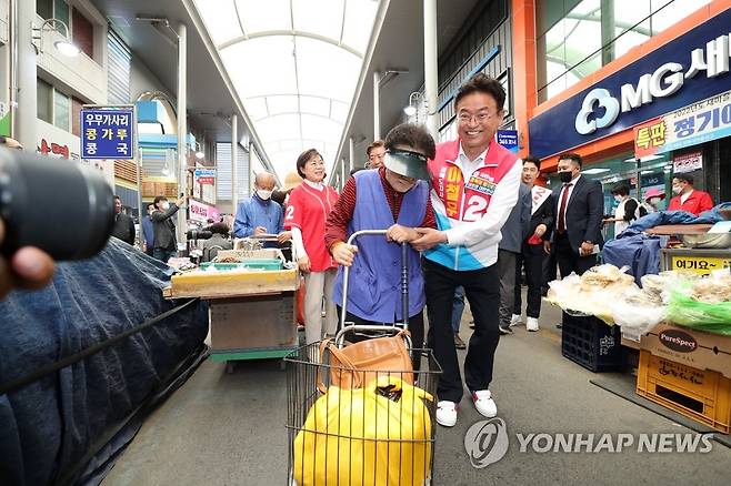 (포항=연합뉴스) 손대성 기자 = 6·1 지방선거 공식 선거운동이 시작된 19일 경북 포항시 북구 죽도동 죽도시장에서 국민의힘 공천을 받은 이철우 경북도지사 후보가 한 시민 손을 잡고 있다. 2022.5.19