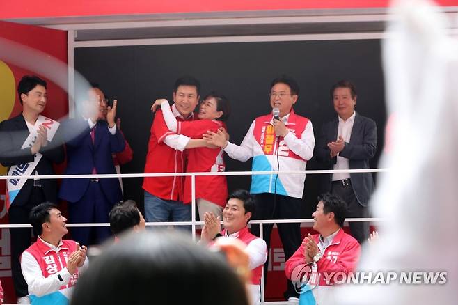 (포항=연합뉴스) 손대성 기자 = 6·1 지방선거 공식 선거운동이 시작된 19일 경북 포항시 북구 죽도동 죽도시장에서 국민의힘 후보들이 출정식을 하는 가운데 경북도당 위원장인 김정재 국회의원(포항 북구·왼쪽에서 네 번째)과 이강덕 포항시장 후보(왼쪽에서 세 번째)가 서로 얼싸안고 있다.