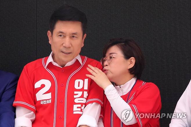 (포항=연합뉴스) 손대성 기자 = 6·1 지방선거 공식 선거운동이 시작된 19일 경북 포항시 북구 죽도동 죽도시장에서 국민의힘 후보들이 출정식을 하는 가운데 경북도당 위원장인 김정재 국회의원(오른쪽에서 두 번째)과 이강덕 포항시장 후보(왼쪽에서 두 번째)가 귓속말하고 있다.