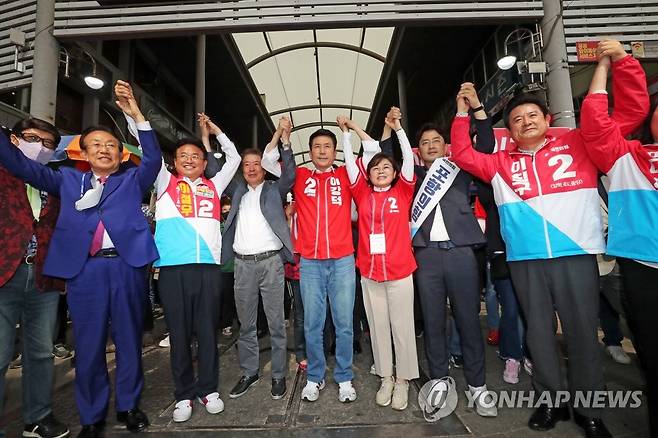 (포항=연합뉴스) 손대성 기자 = 6·1 지방선거 공식 선거운동이 시작된 19일 경북 포항시 북구 죽도동 죽도시장에서 국민의힘 후보들이 출정식을 하고 있다. 2022.5.19