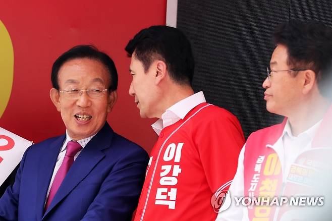 (포항=연합뉴스) 손대성 기자 = 6·1 지방선거 공식 선거운동이 시작된 19일 경북 포항시 북구 죽도동 죽도시장에서 열린 출정식에서 국민의힘 이강덕 포항시장 후보(가운데)와 김관용 전 경북도지사(왼쪽)가 이야기하고 있다. 2022.5.19