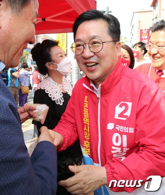 (대전=뉴스1) 김기태 기자 = 이장우 국민의힘 대전시장 후보가 19일 대전 유성구에서 진동규 유성구청장 후보와 합동 유세를 마친 후 시민들에게 지지를 호소하고 있다. 2022.5.19/뉴스1