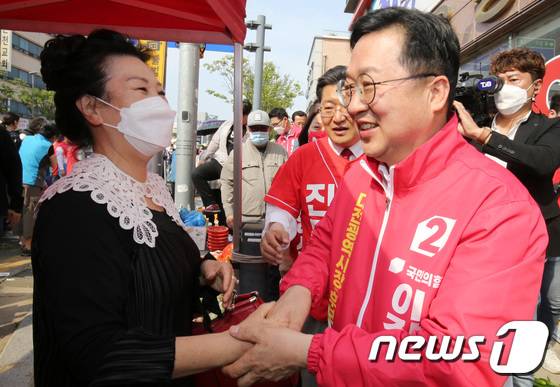 (대전=뉴스1) 김기태 기자 = 이장우 국민의힘 대전시장 후보가 19일 대전 유성구에서 진동규 유성구청장 후보와 합동 유세를 마친 후 시민들에게 지지를 호소하고 있다. 2022.5.19/뉴스1
