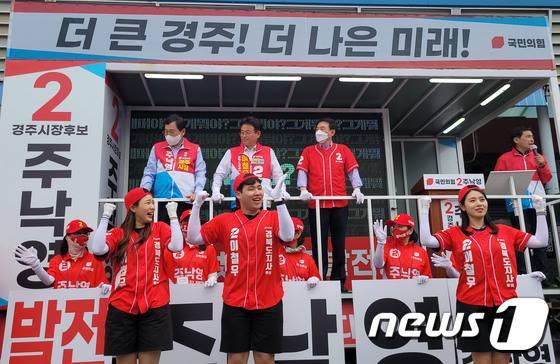 (경주=뉴스1) 김대벽 기자 = 이철우 국민의힘 경북도지사 후보가 6·1지방선거 공식선거운동이 시작된 19일 오후 경북 경주시 안강시장을 찾아 유세차량에서 지지를 호소하고 있다. 2022.5.19/뉴스1