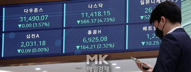 19일 서울 여의도 한국투자신탁 본사에 미국 및 해외 증시 지수가 표시되고있다. 2022.5.19