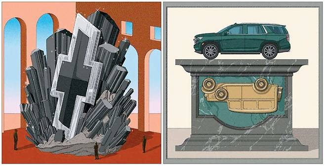 쉐보레가 초대형 스포츠유틸리티차량(SUV) '타호'를 디지털 예술 작품으로 재탄생시킨 대체불가토큰(NFT) 10종을 제작했다고 19일 밝혔다. 이 가운데 2종은 작품당 5개, 나머지 8종은 50개 한정이며 신청자 중 추첨을 통해 총 410명에게 카카오 전자지갑 클립으로 지급된다. 왼쪽부터 최환욱 작가의 '디스커버(DISCOVER)'와 '레거시(LEGACY)'.