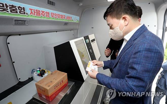 (서울=연합뉴스) 손승현 우정사업본부장이 19일 서울대에서 열린 '자율주행 무인 우체국 시연회'에서 우편물을 접수하고 있다. 2022.5.19 [우정사업본부 제공. 재판매 및 DB 금지]