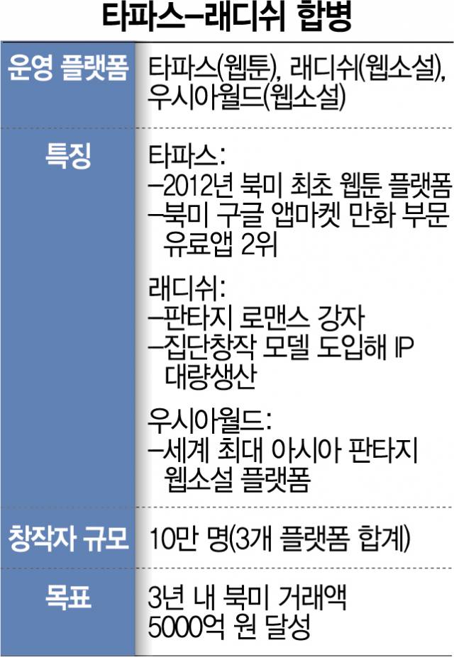 카카오 콘텐츠 전문 자회사 카카오엔터테인먼트는 북미 웹툰 업체 ‘타파스’와 웹소설 업체 ‘래디쉬’를 합병한다고 19일 밝혔다. 새 합병 법인의 최고경영자(CEO)는 김창원 타파스 대표가 맡는다.